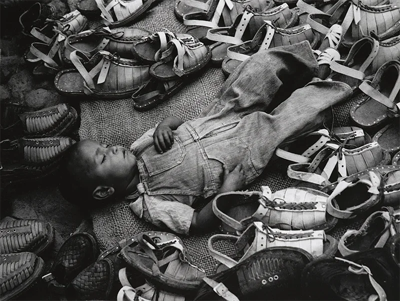 Photograph of a sleeping child surrounded by shoes and sandals. Lola Álvarez Bravo, The Dream of the Poor (El sueño de los pobres), 1949 (printed 1980's), Silver gelatin print